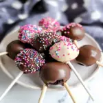 - Insert lollipop sticks into each chilled ball and dip them into the melted coating until fully covered. Place back on parchment paper and add sprinkles if desired.